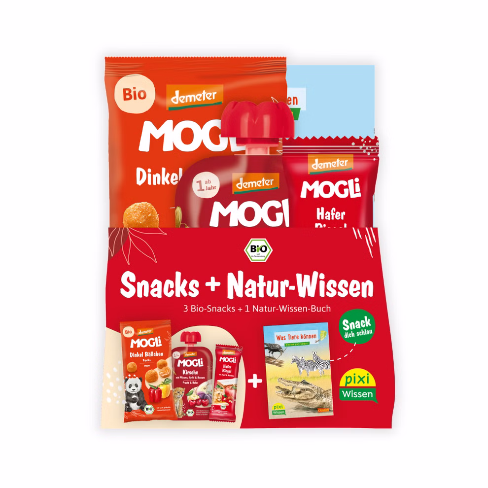 Three tasty organic snacks and an exciting Pixi nature knowledge book await you in this MOGLi-Pixi bundle: Together with MOGLi and Pixi, you're off on an exciting journey of knowledge. The perfect bundle for curious nature fans - whether for the school bag, the holidays or for breaks on the go!
