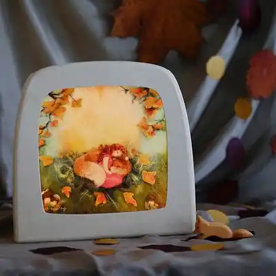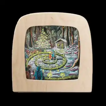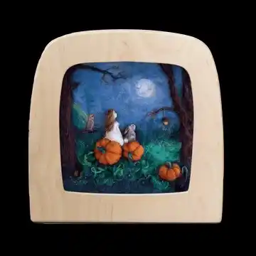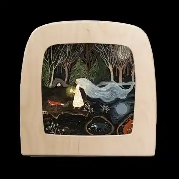 Viele Werke basieren auf klassischen Bilderbuchillustrationen oder neu interpretierten Szenen, die mit Licht eine sanfte Dramatik erhalten.
