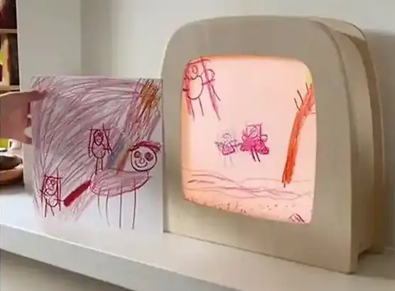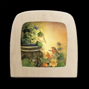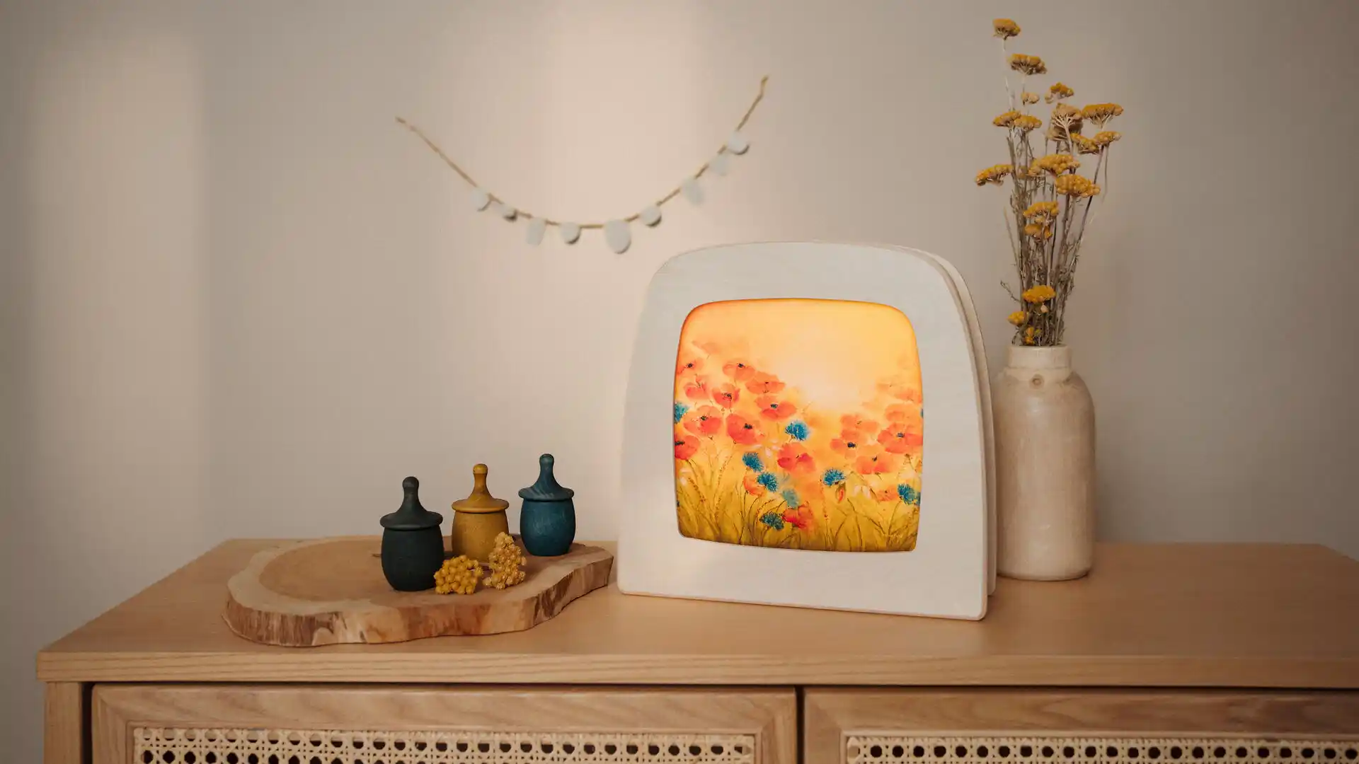 - Lampen & Rahmen: Das Kernstück ist die Holzlampe mit dimmbarer LED und dem passenden Rahmen, in den wechselbare Motive eingeschoben werden.