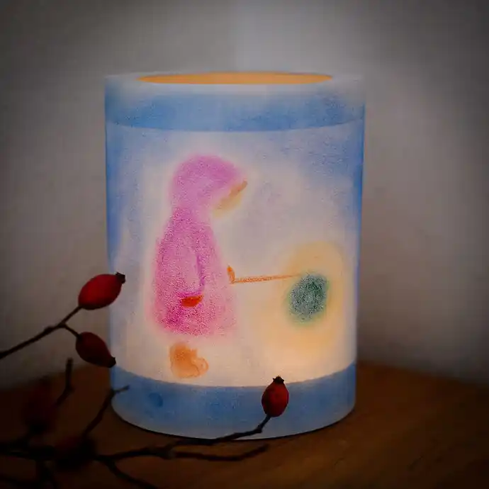 Werksiedlung St. Chr. | Engelskerze, natur | Bienenwachs | H 12,5 cm 100 % Bienenwachs Beim Abbrennen dieser nach Honig duftenden Bienenwachskerze zeigen sich nach und nach die Engelsflügel. 11,5 x 3,5 x 12,5 cm.