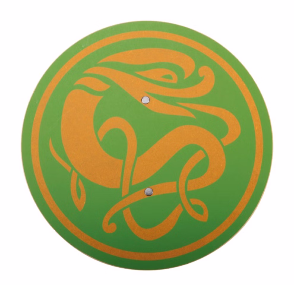 Das goldene Schlangen-Motiv auf dem rundem grünem Schild gibt dem Rollenspieler extra Kraft. Auf der Rückseite befindet sich ein Halteriemen aus Kunstleder.