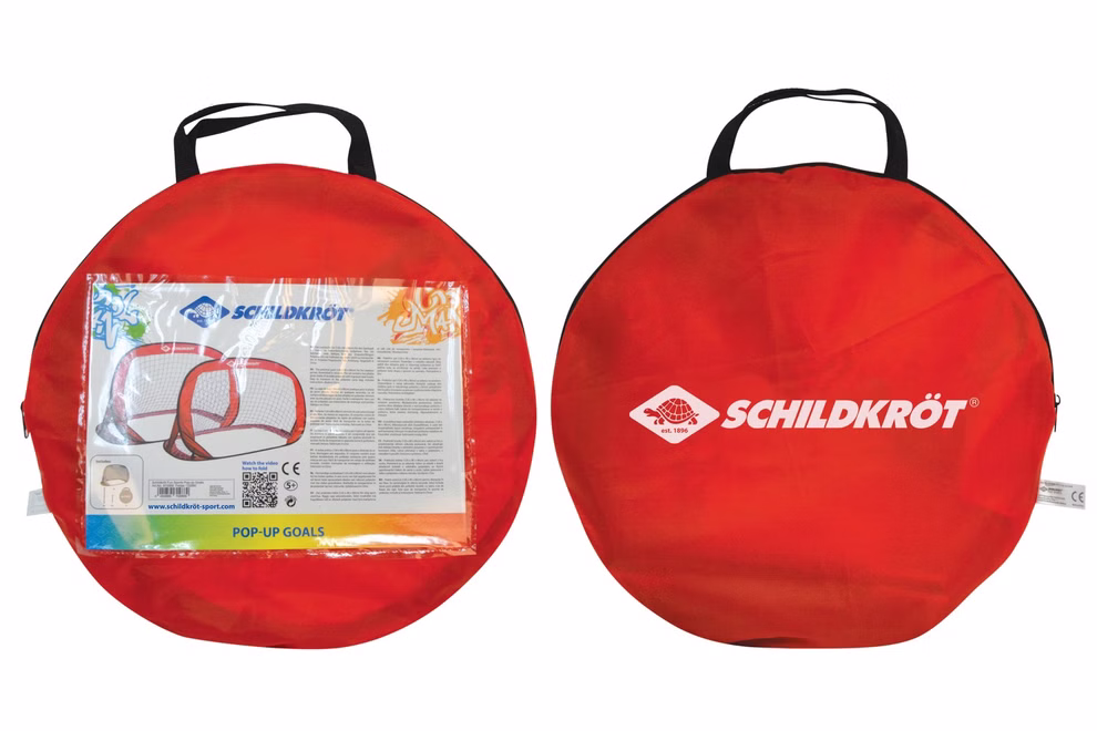 Das neue Pop-Up Goal von Schildkröt ist immer genau dann richtig, wenn sie oder ihre Kids mal wieder Lust auf ein spontanes Match haben. Die beiden Tore (2er Set) sind in einer praktischen runden Tasche mit Reißverschluss und Tragegriffen verpackt (ø 33 cm, 2,5 cm dick). Herausgeholt springen die Tore von selbst auf und entfalten sich. Es müssen dann nur noch schnell 2 beilegende Glasfaserstäbe je Tor eingeschoben werden, damit die Tore aufrecht stehen. Mit den ebenfalls enthaltenen Heringen werden die Tore im Boden verankert. Das wars schon - kein Werkzeug, kein Zusammenstecken, kein Schrauben - ruck zuck fertig. Kinderleicht. Los geht das Spiel. Auch der Abbau nach dem anstrengenden Match geht schnell und leicht; wer anfangs eine Überwindung verspürt, die Tore wieder zusammen zu falten (wie eine 8 zusammen zu legen) dem hilft ein Anleituungsvideo, das sich hinter dem QR Code auf der Verpackung verbirgt. Die Tore haben eine kompakte Größe von 120 x 80 x 80 cm und sind daher auch für den kleineren Garten geeignet. Sie sind platzsparend, leicht zu transportieren, leicht mitzunehmen (bspw. auf den Ausflug zum Strand, See oder auch in den Campingurlaub). Einfach vielseitig. Wetterfestes Polyester-Material. Zu diesem Tor passen auch ideal die beliebten Neopren-Fußbälle / Beachsoccer von Schildkröt - nicht im Lieferumfang enthalten!