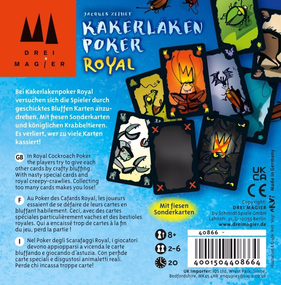 Mit Kakerlakenpoker Royal tauchst du in ein lebhaftes Bluffspiel ein, das jede Runde spannend hält. Neue Royal- und Sonderkarten bringen frischen Schwung ins bekannte Krabbeltier-Chaos und fordern dich heraus, deine Mitspieler geschickt zu täuschen. Du versuchst, ihnen unliebsame Tierkarten unterzujubeln und gleichzeitig ihre Bluffs zu durchschauen. Wer am Ende zu viele Karten sammelt, verliert – ein leicht zugängliches Spiel, das dennoch Raum für clevere Taktik lässt.