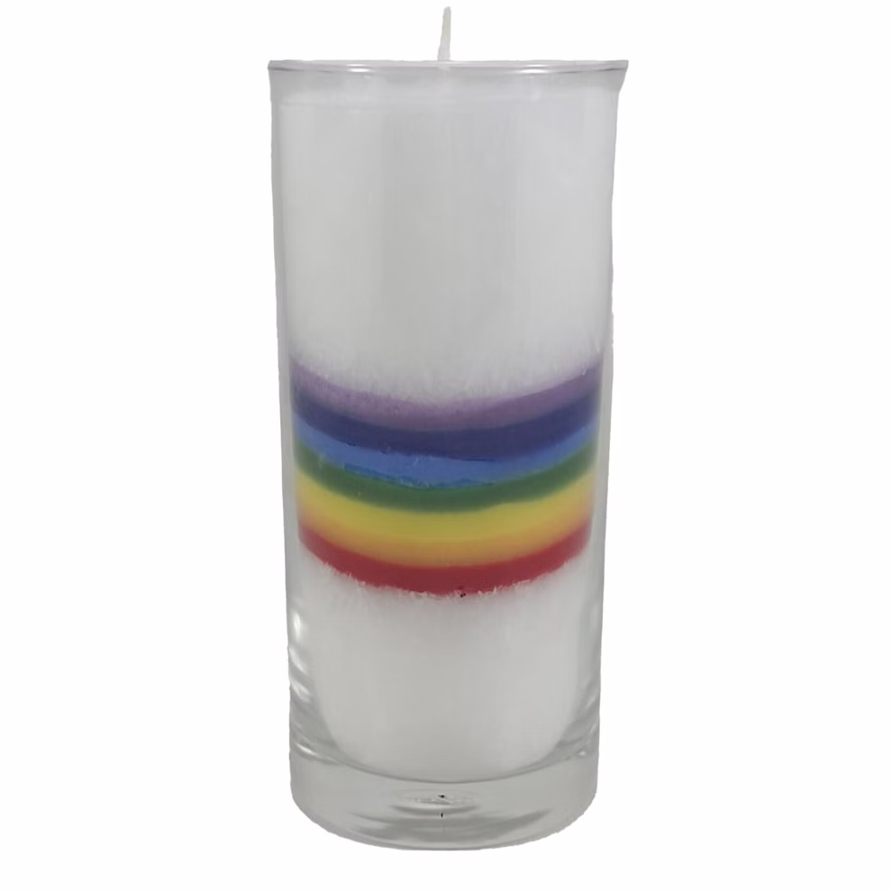 Die Kerze in Weiß mit einem mehrfarbigen Chakra-Bogen ist eine stilvolle Kerze, die aus nachhaltigem Palm- und Kokoswachs hergestellt wird. Mit einer Größe von etwa 6,6 cm im Durchmesser und 14 cm in der Höhe ist sie ein attraktiver Blickfang für jeden Raum.