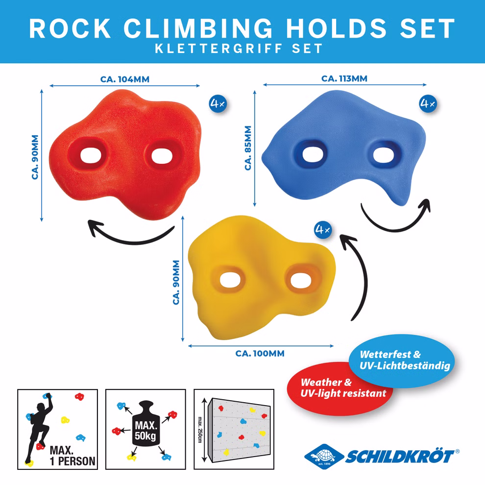 Das Schildkröt Klettergriff Set besteht aus 12 Kunststoffklettergriffen (PP) in 3 verschiedenen Griffformen und Farben. Befestigungsmaterial nicht im Lieferumfang enthalten.