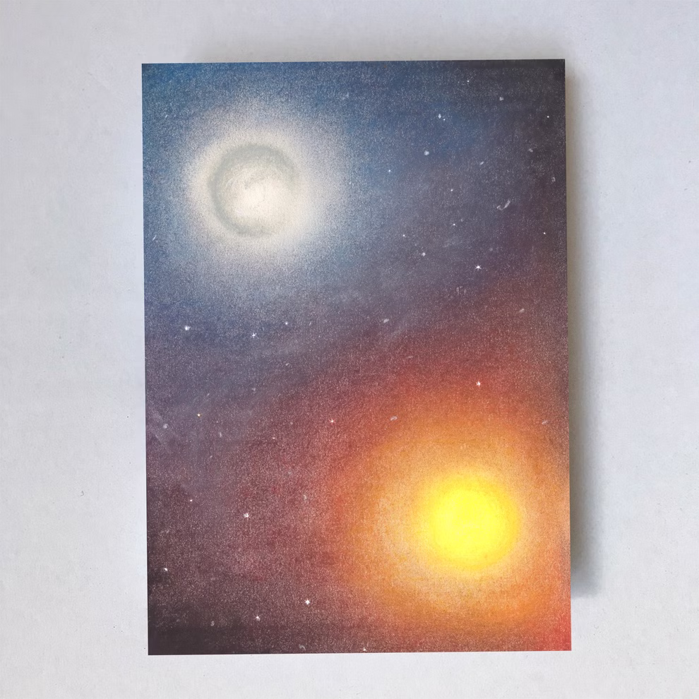 Diese Postkarte im Format A6 zeigt zwei Planeten im Weltraum, die von Lot Bouwes mit Pastellkreide gezeichnet wurden. Die Illustration besticht durch ihren weichen Farbauftrag und die typische Struktur der Kreidetechnik, was dem Motiv eine besondere Tiefe verleiht. Gedruckt auf hochwertigem 350 g Papier mit einer subtilen Struktur, fühlt sich die Karte besonders wertig an und eignet sich ebenso gut zum Aufstellen in einem Rahmen oder auf dem Jahreszeitentisch. Die Rückseite bietet dir genügend Platz für eine persönliche Nachricht.