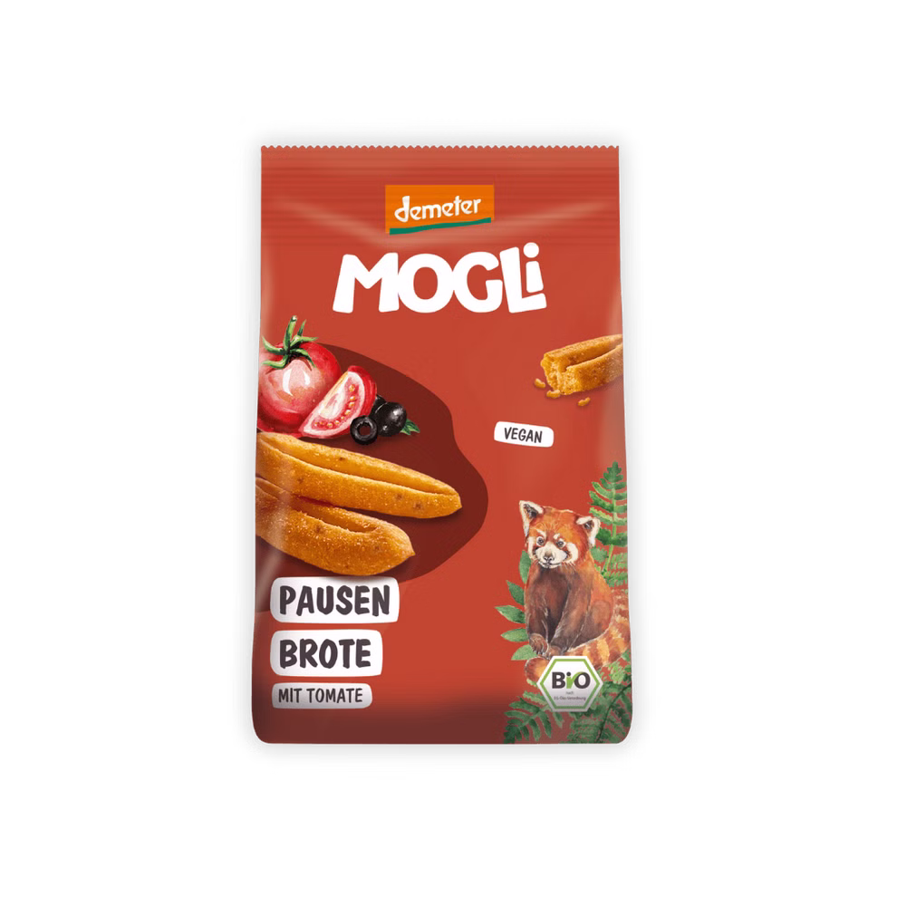 Knusperpause mal anders: Die MOGLi Pausen Brote Tomate sind die perfekte Stärkung für kleine Entdecker:innen. Gebacken mit Hartweizenmehl aus biologisch-dynamischem Anbau, verfeinert mit sonnengereiften Tomaten und italienischen Oliven, bringen sie knusprig mediterranen Geschmack in jede Brotdose.