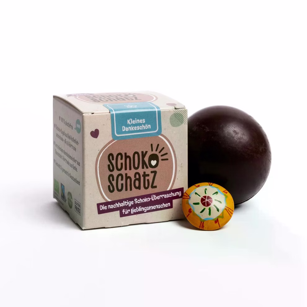 Mit dem SchokoSchatz verschenkst du ein kleines, feines Dankeschön: eine vegane Bio-Schokokugel aus fair gehandelter Zartbitterschokolade kombiniert mit einem handbemalten Blumenstein aus Speckstein. Jeder Stein ist ein Unikat, sorgfältig von Hand geschnitzt, geschliffen, bemalt und mit Wachs poliert. So wird aus der süßen Überraschung ein bleibendes Erinnerungsstück, das Freude und Wertschätzung ausdrückt.