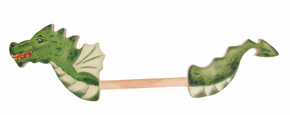 Das Steckenpferd besteht aus Holz und zeigt einen grünen Drachen mit Flügeln und Zackenschwanz. Kopf und Schwanz sind bunt bedruckt, während das übrige Design schlicht gehalten ist. Durch die flache Machart lässt sich das Steckenpferd einfach verstauen und schnell wieder hervorholen, wenn das nächste Abenteuer beginnt.