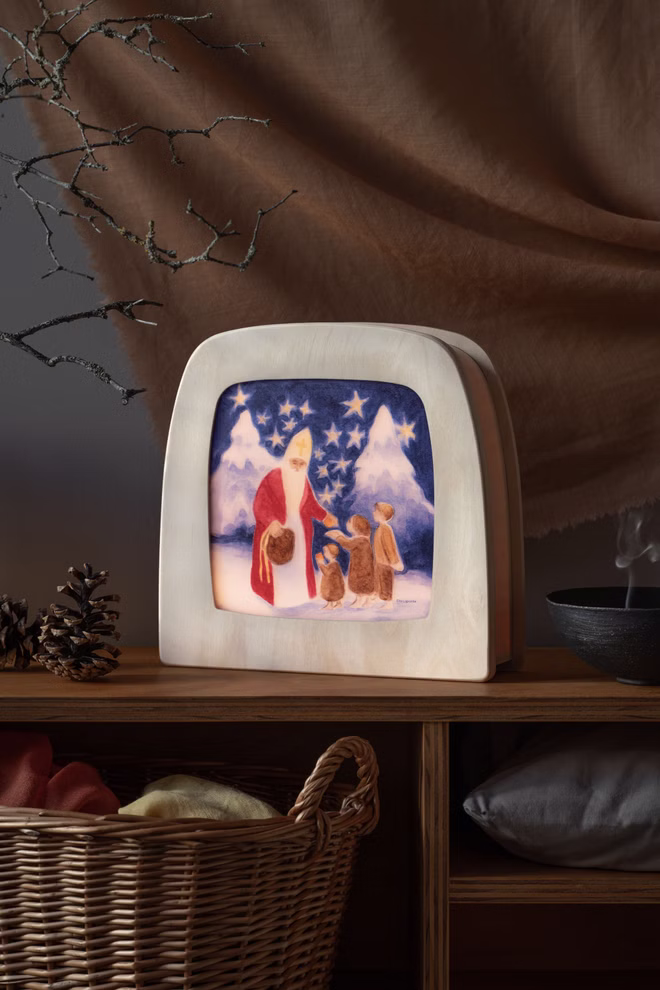 Mit der Magic Lamp von Toverlux schenkst du deinem Kinderzimmer eine besondere Atmosphäre. Im Starter-Set sind drei Silhouetten mit Illustrationen von Ella la Pointe enthalten: eine Weihnachtskrippe, ein geschmückter Tannenbaum mit Kind sowie der Nikolaus mit Kindern. Durch das warme LED-Licht erwachen die Bilder sanft zum Leben und laden zum Staunen und Träumen ein.