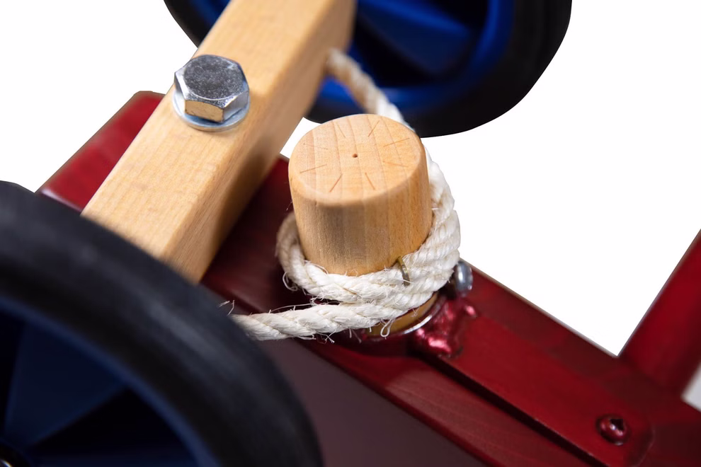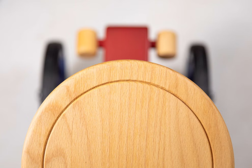 Ein formschönes Fahrzeug in einem leuchtenden Rot. Aus einheimischem Fichtenholz mit stabilen Kunststoffrädern in einer Werkstatt für Menschen mit Behinderung gefertigt.