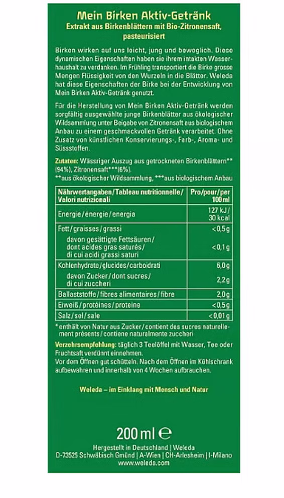 Verzehrsempfehlung: 2 mal täglich 1 Esslöffel Weleda Birken Aktiv-Getränk in Wasser, Fruchtsaftschorle oder Tee einnehmen.